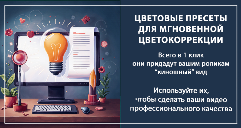 - БОНУС 2 Набор цветовых пресетов для мгновенной цветокоррекции. Всего в 1 клик они сделают ваши видео профессионального качества и придадут ему "киношный" вид. (5.000 руб. Бесплатно!)