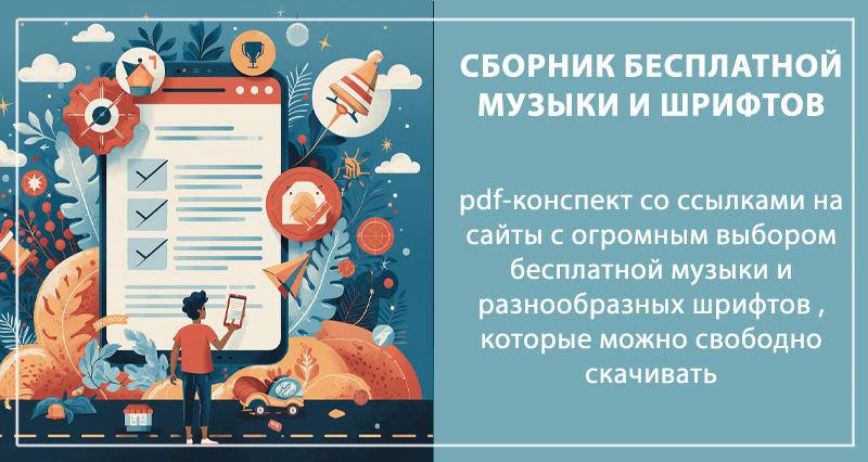 - БОНУС 3 Сборник источников бесплатной музыки и шрифтов для монтажа — pdf-конспект со ссылками на сайты с огромным выбором бесплатной музыки и разнообразных шрифтов, которые свободно можно скачивать (10.000 руб. Бесплатно!)