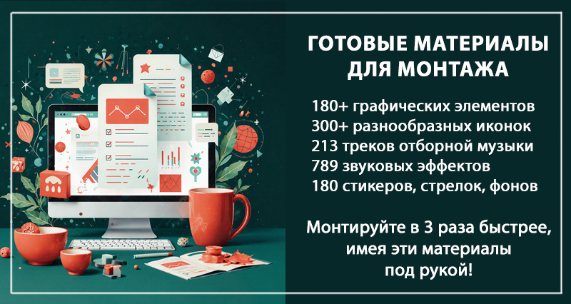- БОНУС №1 Сборник готовых материалов для видеомонтажа (1650+ элементов музыки, иконок, переходов, фонов, звуков) (ценность 7.000 руб.)