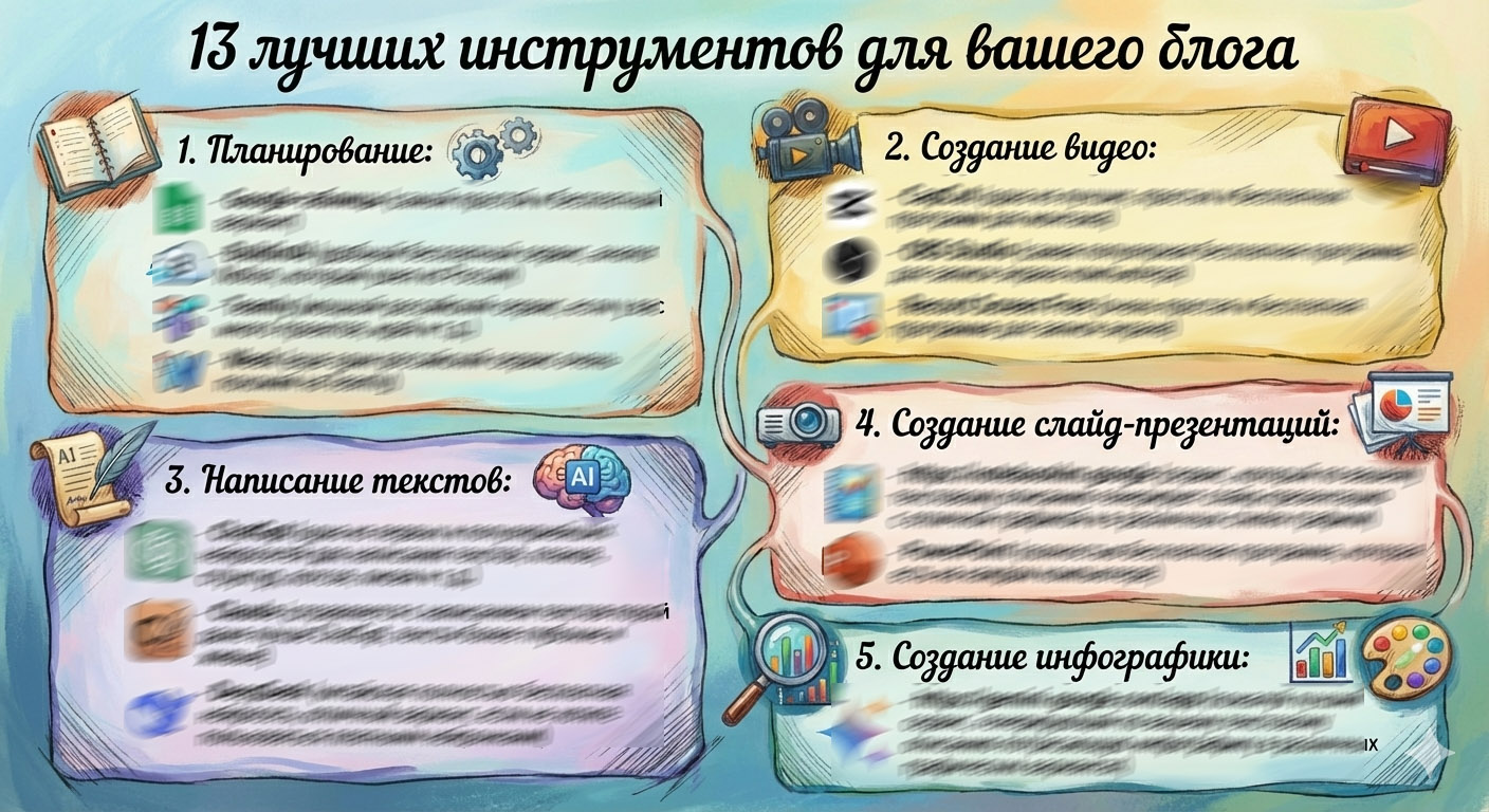 Инфографика "13 лучших инструментов для блога" Обзор самых популярных программ и сервисов для планирования, создания текстов, видео, инфографики, слайд-презентаций